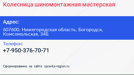 Колесница, шиномонтажная мастерская по адресу 607600, Нижегородская область, Богородск, Комсомольская, 34Б в дальнейшем Организация, размещена в следующих категориях: