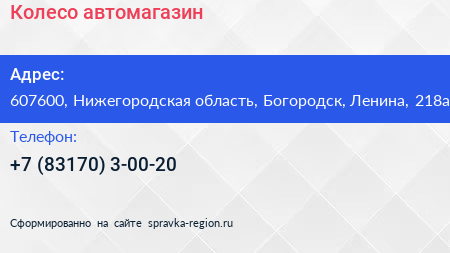 Колесо, автомагазин по адресу 607600, Нижегородская область, Богородск, Ленина, 218а в дальнейшем Организация, размещена в следующих категориях:
