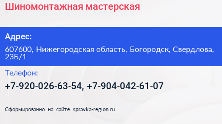 Шиномонтажная мастерская по адресу 607600, Нижегородская область, Богородск, Свердлова, 23Б/1 в дальнейшем Организация, размещена в следующих категориях: