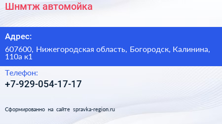 Шнмтж, автомойка по адресу 607600, Нижегородская область, Богородск, Калинина, 110а к1 в дальнейшем Организация, размещена в следующих категориях: