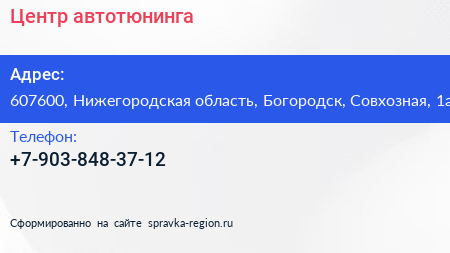 Центр автотюнинга по адресу 607600, Нижегородская область, Богородск, Совхозная, 1а в дальнейшем Организация, размещена в следующих категориях: