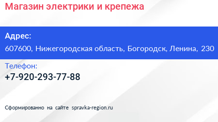 Магазин электрики и крепежа по адресу 607600, Нижегородская область, Богородск, Ленина, 230 в дальнейшем Организация, размещена в следующих категориях: