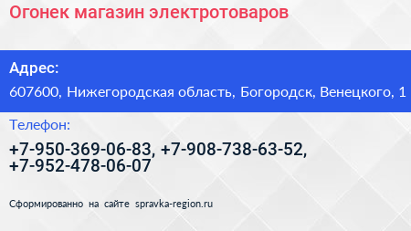 Огонек, магазин электротоваров по адресу 607600, Нижегородская область, Богородск, Венецкого, 1 в дальнейшем Организация, размещена в следующих категориях:
