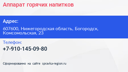 Аппарат горячих напитков по адресу 607600, Нижегородская область, Богородск, Комсомольская, 23 в дальнейшем Организация, размещена в следующих категориях: