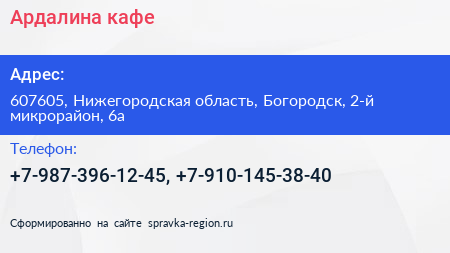 Ардалина, кафе по адресу 607605, Нижегородская область, Богородск, 2-й микрорайон, 6а в дальнейшем Организация, размещена в следующих категориях: