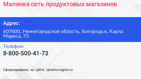 Малинка, сеть продуктовых магазинов по адресу 607600, Нижегородская область, Богородск, Карла Маркса, 73 в дальнейшем Организация, размещена в следующих категориях: