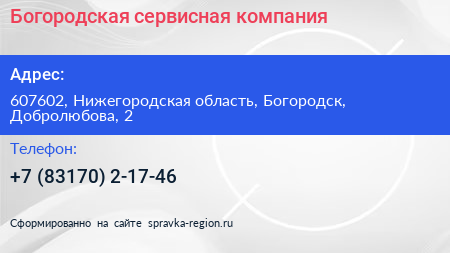 Богородская сервисная компания по адресу 607602, Нижегородская область, Богородск, Добролюбова, 2 в дальнейшем Организация, размещена в следующих категориях:
