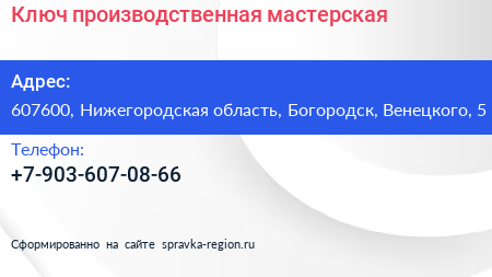 Ключ, производственная мастерская по адресу 607600, Нижегородская область, Богородск, Венецкого, 5 в дальнейшем Организация, размещена в следующих категориях: