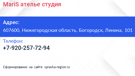 MariS, ателье-студия по адресу 607600, Нижегородская область, Богородск, Ленина, 101 в дальнейшем Организация, размещена в следующих категориях:
