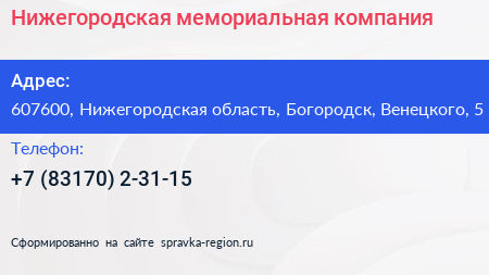 Нижегородская мемориальная компания по адресу 607600, Нижегородская область, Богородск, Венецкого, 5 в дальнейшем Организация, размещена в следующих категориях: