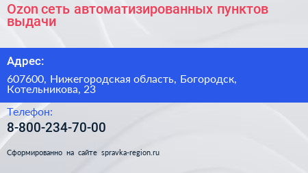 Ozon, сеть автоматизированных пунктов выдачи по адресу 607600, Нижегородская область, Богородск, Котельникова, 23 в дальнейшем Организация, размещена в следующих категориях: