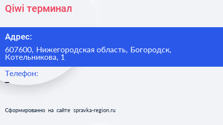 Qiwi, терминал по адресу 607600, Нижегородская область, Богородск, Котельникова, 1 в дальнейшем Организация, размещена в следующих категориях: