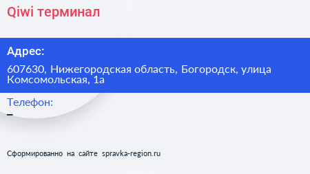 Qiwi, терминал по адресу 607630, Нижегородская область, Богородск, улица Комсомольская, 1а в дальнейшем Организация, размещена в следующих категориях: