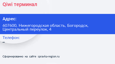 Qiwi, терминал по адресу 607600, Нижегородская область, Богородск, Центральный переулок, 4 в дальнейшем Организация, размещена в следующих категориях: