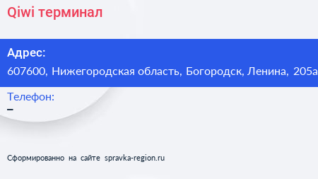 Qiwi, терминал по адресу 607600, Нижегородская область, Богородск, Ленина, 205а в дальнейшем Организация, размещена в следующих категориях: