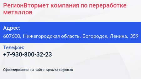 РегионВтормет, компания по переработке металлов по адресу 607600, Нижегородская область, Богородск, Ленина, 359 в дальнейшем Организация, размещена в следующих категориях: