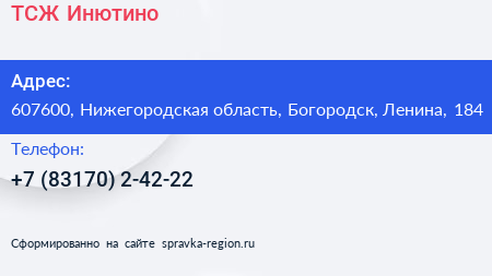 ТСЖ Инютино по адресу 607600, Нижегородская область, Богородск, Ленина, 184 в дальнейшем Организация, размещена в следующих категориях: