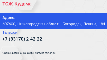 ТСЖ Кудьма по адресу 607600, Нижегородская область, Богородск, Ленина, 184 в дальнейшем Организация, размещена в следующих категориях: