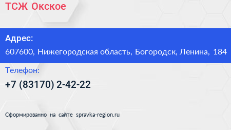 ТСЖ Окское по адресу 607600, Нижегородская область, Богородск, Ленина, 184 в дальнейшем Организация, размещена в следующих категориях: