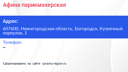 Афина, парикмахерская по адресу 607600, Нижегородская область, Богородск, Кузнечный переулок, 1 в дальнейшем Организация, размещена в следующих категориях: