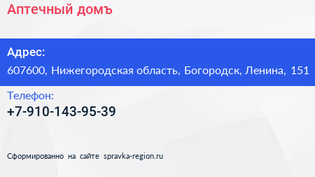 Аптечный домъ по адресу 607600, Нижегородская область, Богородск, Ленина, 151 в дальнейшем Организация, размещена в следующих категориях: