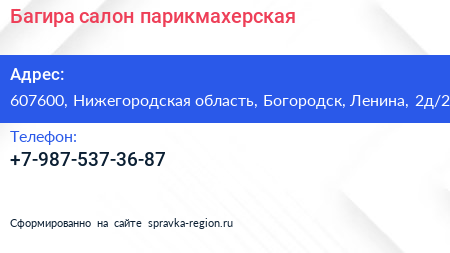 Багира, салон-парикмахерская по адресу 607600, Нижегородская область, Богородск, Ленина, 2д/2 в дальнейшем Организация, размещена в следующих категориях: