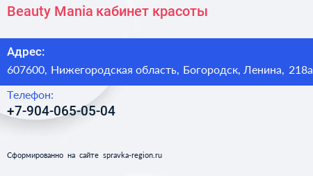 Beauty Mania, кабинет красоты по адресу 607600, Нижегородская область, Богородск, Ленина, 218а в дальнейшем Организация, размещена в следующих категориях: