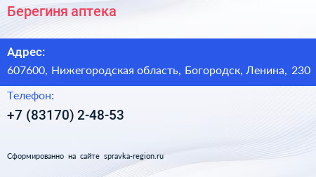 Берегиня, аптека по адресу 607600, Нижегородская область, Богородск, Ленина, 230 в дальнейшем Организация, размещена в следующих категориях: