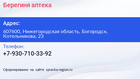Берегиня, аптека по адресу 607600, Нижегородская область, Богородск, Котельникова, 23 в дальнейшем Организация, размещена в следующих категориях:
