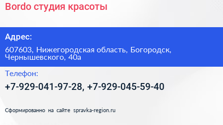 Bordo, студия красоты по адресу 607603, Нижегородская область, Богородск, Чернышевского, 40а в дальнейшем Организация, размещена в следующих категориях: