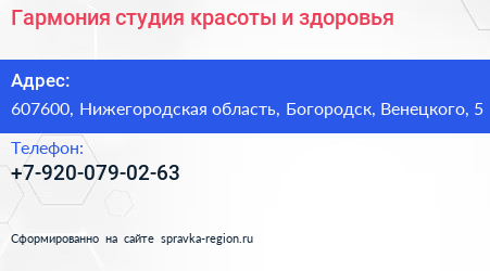 Гармония, студия красоты и здоровья по адресу 607600, Нижегородская область, Богородск, Венецкого, 5 в дальнейшем Организация, размещена в следующих категориях: