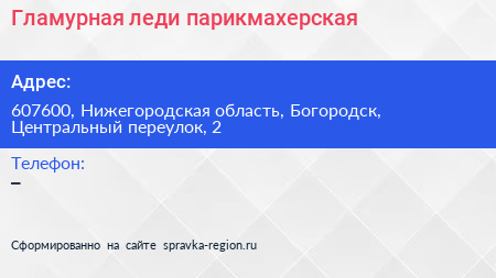 Гламурная леди, парикмахерская по адресу 607600, Нижегородская область, Богородск, Центральный переулок, 2 в дальнейшем Организация, размещена в следующих категориях:
