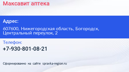 Максавит, аптека по адресу 607600, Нижегородская область, Богородск, Центральный переулок, 2 в дальнейшем Организация, размещена в следующих категориях: