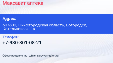 Максавит, аптека по адресу 607600, Нижегородская область, Богородск, Котельникова, 1а в дальнейшем Организация, размещена в следующих категориях: