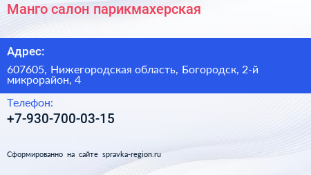 Манго, салон-парикмахерская по адресу 607605, Нижегородская область, Богородск, 2-й микрорайон, 4 в дальнейшем Организация, размещена в следующих категориях: