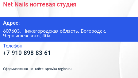 Net Nails, ногтевая студия по адресу 607603, Нижегородская область, Богородск, Чернышевского, 40а в дальнейшем Организация, размещена в следующих категориях:
