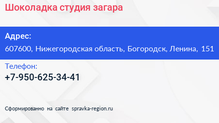 Шоколадка, студия загара по адресу 607600, Нижегородская область, Богородск, Ленина, 151 в дальнейшем Организация, размещена в следующих категориях: