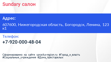 Sundary, салон по адресу 607600, Нижегородская область, Богородск, Ленина, 123 к1 в дальнейшем Организация, размещена в следующих категориях: