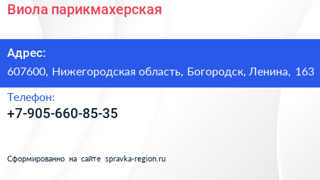 Виола, парикмахерская по адресу 607600, Нижегородская область, Богородск, Ленина, 163 в дальнейшем Организация, размещена в следующих категориях: