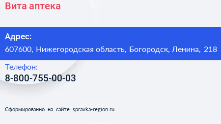 Вита, аптека по адресу 607600, Нижегородская область, Богородск, Ленина, 218 в дальнейшем Организация, размещена в следующих категориях: