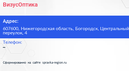 ВизусОптика по адресу 607600, Нижегородская область, Богородск, Центральный переулок, 4 в дальнейшем Организация, размещена в следующих категориях: