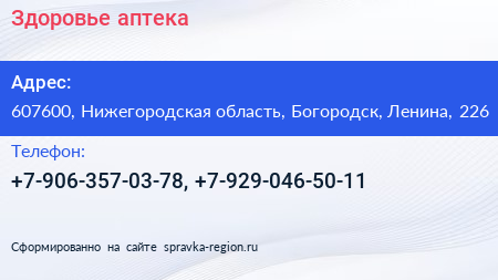 Здоровье, аптека по адресу 607600, Нижегородская область, Богородск, Ленина, 226 в дальнейшем Организация, размещена в следующих категориях: