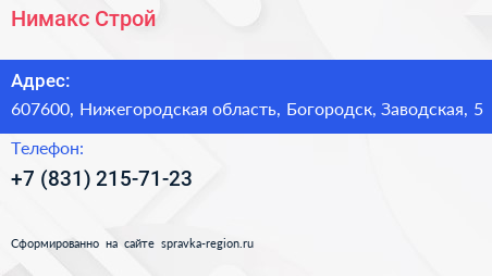 Нимакс-Строй по адресу 607600, Нижегородская область, Богородск, Заводская, 5 в дальнейшем Организация, размещена в следующих категориях: