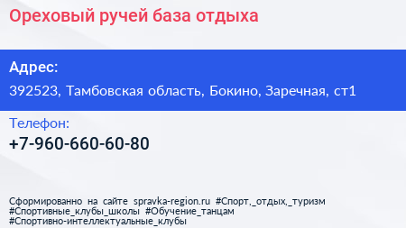 Ореховый ручей, база отдыха по адресу 392523, Тамбовская область, Бокино, Заречная, ст1 в дальнейшем Организация, размещена в следующих категориях: