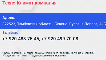 Техно-Климат, компания по адресу 392523, Тамбовская область, Бокино, Руслана Попова, 44Б в дальнейшем Организация, размещена в следующих категориях: