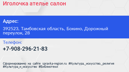 Иголочка, ателье-салон по адресу 392523, Тамбовская область, Бокино, Дорожный переулок, 28 в дальнейшем Организация, размещена в следующих категориях: