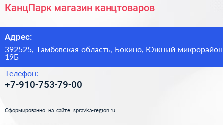 КанцПарк, магазин канцтоваров по адресу 392525, Тамбовская область, Бокино, Южный микрорайон, 19Б в дальнейшем Организация, размещена в следующих категориях: