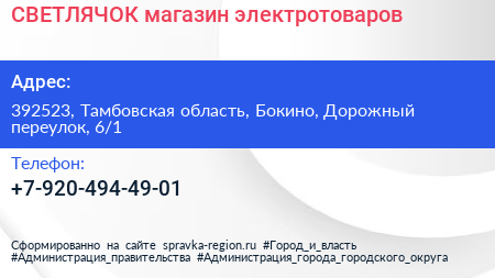 СВЕТЛЯЧОК, магазин электротоваров по адресу 392523, Тамбовская область, Бокино, Дорожный переулок, 6/1 в дальнейшем Организация, размещена в следующих категориях: