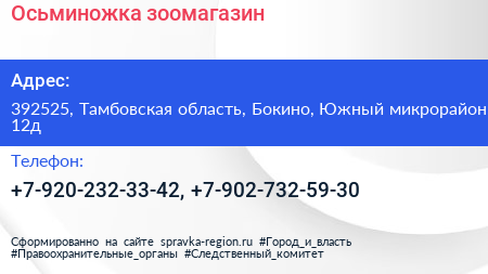Осьминожка, зоомагазин по адресу 392525, Тамбовская область, Бокино, Южный микрорайон, 12д в дальнейшем Организация, размещена в следующих категориях: