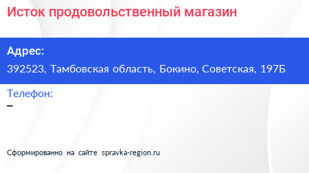 Исток, продовольственный магазин по адресу 392523, Тамбовская область, Бокино, Советская, 197Б в дальнейшем Организация, размещена в следующих категориях: